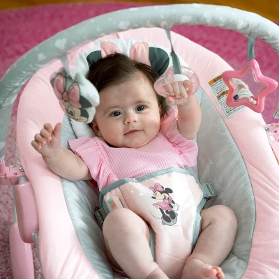 The magic of Minnie will help any baby girl go from grumpy to giggly. The light pink and gray baby bouncer from Disney Baby and Bright Starts relaxes your little one in a deep, comfortable baby seat. This soon-to-be favorite safely supports baby’s head with an extra-plush pillow. Bonus – it features those iconic Minnie Mouse ears and her signature bow for maximum adorability! No matter how much she wiggles in this bouncy seat, baby is safe and secure with the 3-point harness and nonslip feet. Three playtime toys, including a rattle, heart teether and Minnie Mouse bead chaser toy, keep baby content as she bounces. Soothing vibrations and 7 soft melodies make this the best seat in the Minnie-Mouse-house.