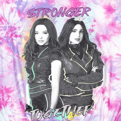 - Featuring villains Mal and Evie in black and white with neon highlights and the words “Stronger Together” on romper top