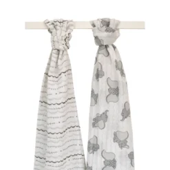 Swaddle your baby with the Disney Baby Dumbo Muslin Blankets! This 100% cotton muslin 2Pk blanket set in white and gray features two separate Dumbo prints. A plush Dumbo rattle is also included. The blankets measure 44″ x 44″. This boxed set makes a wonderful gift and coordinates with the full line of Disney Baby giftables!