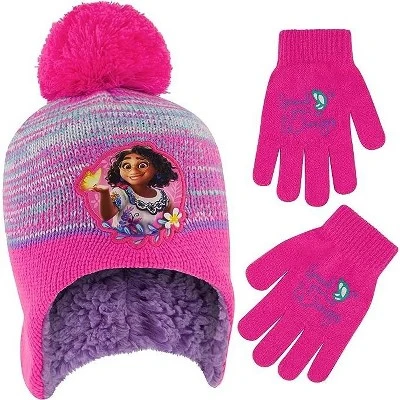 Designed to keep little hands and ears warm, this acrylic knit hat and mitten/glove sets are a must-have for animated outdoor adventures. For added style, the hat is topped off with cute pom poms.