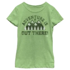 - Strut your stuff with this stylish new Girls’ tee that is perfect for every occasion! Featuring a distressed graphic of mountains, pine trees, and the silhouette of Carl’s flying house with the phrase: ” Adventure Is Out There.”