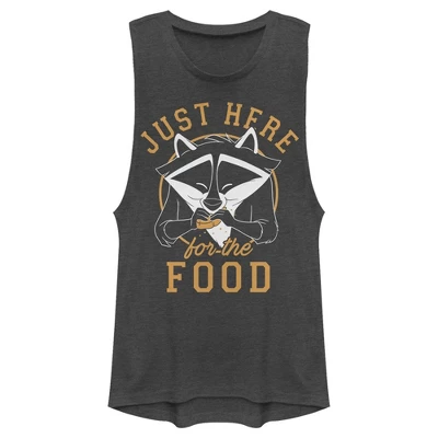 - Strut your stuff with this stylish new everyday Juniors’ Festival Muscle Tank Top that is perfect for every occasion! Featuring an adorable portrait of Meeko the raccoon eating a biscuit along with the iconic quote: “Just Here for the Food” printed in orange letters.