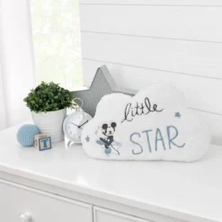The Mickey Mouse Little Star Decorative Pillow is perfect for your little dreamer! This 16″ x 10.5″ white cloud shaped pillow features embroidered Mickey Mouse sitting on a star with embroidered blue and black lettering. This whimsical cloud pillow has a bean bag bottom style so it always sits upright. Made from super soft Sherpa fabric all around. A wonderful decorative accent for any nursery or toddler room and is great to take anywhere your little one wants to snuggle! Spot clean only.