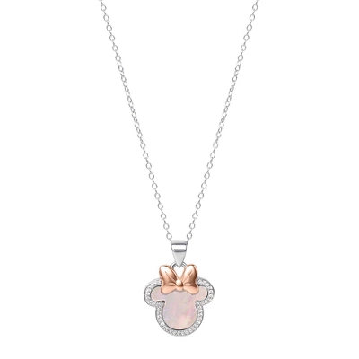 The Disney Minnie Mouse Mother Of Pearl And Cubic Zirconia Necklace Delights With Mixed Mediums And Tones To Create A Sensational Look. The Sterling Silver Design Is Topped With Minnie’S Signature Bow In Rose Gold Plating And Features A Shimmering Mother Of Pearl Minnie Icon Surrounded By Sparkling Cubic Zirconias. The Pendant Is Attached To A Gleaming Sterling Silver Bail And Includes An 18″ Cable Link Chain. An Elegant, Standout Style Perfect For Minnie Mouse Fans To Give And Receive! .925 Sterling Silver With Rose Gold Plated Accent; Pendant Measures: 0.8268″ L X 0.6008″ W; Mother Of Pearl; Cubic Zirconia Border; 18-Inch Chain; Spring Ring Closure. Arrives In An Authentic Disney Gift Box. Officially Licensed Disney Jewelry From Sallyrose Pleases Generations Young And Old With Timeless, Quality, Handcrafted Designs.