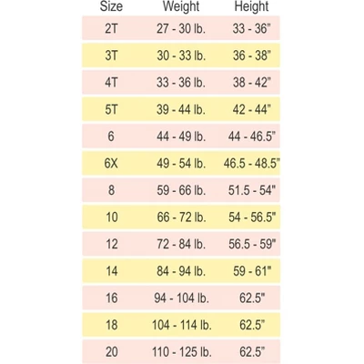| 14-16 | 94-104 Lbs | 33 1/2 | 36 | 61 1/2” |