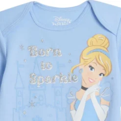 - Artwork featuring Princess Cinderella, Ariel The Little Mermaid, and Princess Belle; Blue gown features screen print of Cinderella with the text “born to sparkle” in silver glitter; Pink gown features screen print of Cinderella, Ariel The Little Mermaid, and Princess Belle with the text “little dreamers; White gown features all-over print of all three princesses