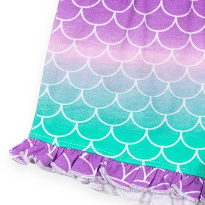 - Featuring Ariel in awesome screen print design with purple glitter on shirt; All-over mermaid scales print in purple/green gradient on shorts