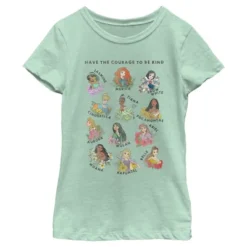 - Strut your stuff with this stylish new Girls’ Graphic T-Shirt that is perfect for every occasion! Featuring Jasmin, Merida, Tiana, Pocahontas, Mulan, Moana, Rapunzel, Aurora, Ariel, Cinderella, Snow White, and Belle in a sketch art style along with the phrase: “Have the courage to be kind.”