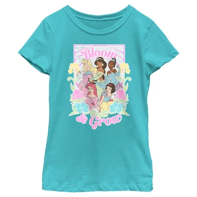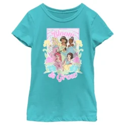 - Strut your stuff with this stylish new Girls’ Graphic T-Shirt that is perfect for every occasion! Featuring Aurora, Jasmin, Ariel, Snow White, and Tiana in a beautiful pastel color palette with the phrase: “Bloom and Grow,” around them.