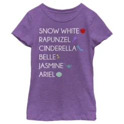 - Strut your stuff with this stylish new girls’ t-shirt that is perfect for every occasion! Featuring a list with the names of Snow White, Rapunzel, Cinderella, Belle, Jasmine, and Ariel along with their iconic items, including the apple, glass slipper, rose, magic lamp, seashell, and a hair brush printed across the front.