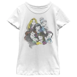 - Strut your stuff with this stylish new every day girls’ t-shirt that is perfect for every occasion! Featuring a distressed black graphic of Cinderella, Belle, Rapunzel, Ariel, Jasmine, and Snow White.