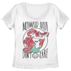 - Strut your stuff with this stylish new every day girls’ t-shirt that is perfect for every occasion! Featuring a distressed graphic of Ariel combing her red hair while framed by the text “Mermaid Hair Don’t Care” across the center.