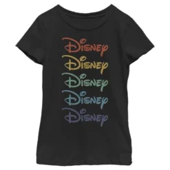 - Strut your stuff with this stylish new girls’ t-shirt that is perfect for every occasion! Featuring a stack of iconic and recognizable Disney logos in different rainbow colors across the front.