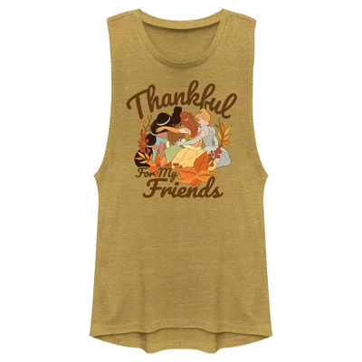 - Strut your stuff with this stylish new juniors’ festival muscle tank top that is perfect for fall! Featuring Jasmine, Tiana, Belle, and Cinderella hugging each other framed by autumn leaves and the phrase: “Thankful for my Friends” across the front.