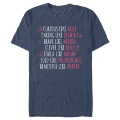 - Strut your stuff with this stylish new men’s t-shirt that is perfect for every occasion! Featuring the words: “Curious Like Ariel, Daring Like Jasmine, Brave Like Merida, Clever Like Belle, Tough Like Mulan, Bold Like Pocahontas, Beautiful Like Aurora” in white and red lettering across the front.
