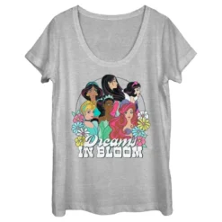 - Strut your stuff with this stylish new women’s t-shirt that is perfect for every occasion! Featuring Jasmine, Mulan, Snow White, Cinderella, Tiana, and Ariel in a pretty bright print, surrounded by colorful flowers and the text: “Dreams in Bloom” in white lettering.